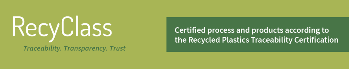 Im Rahmen unseres Engagements für vollständige Transparenz und ökologische Verantwortung hat unser Unternehmen die RecyClass-Zertifizierung des Recyclingprozesses eingeführt, die den Normen EN 15343:2007 und ISO 22095:2020 entspricht. Diese Zertifizierung bestätigt die Qualität unserer Recyclingverfahren sowie die transparente Herkunft der von uns verwendeten Recyclingmaterialien.